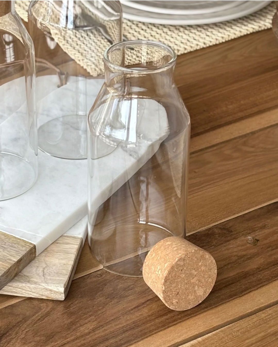 Elegante y funcional, esta botella de vidrio transparente con tapa de corcho es perfecta para almacenar y servir agua jugos o infusiones.